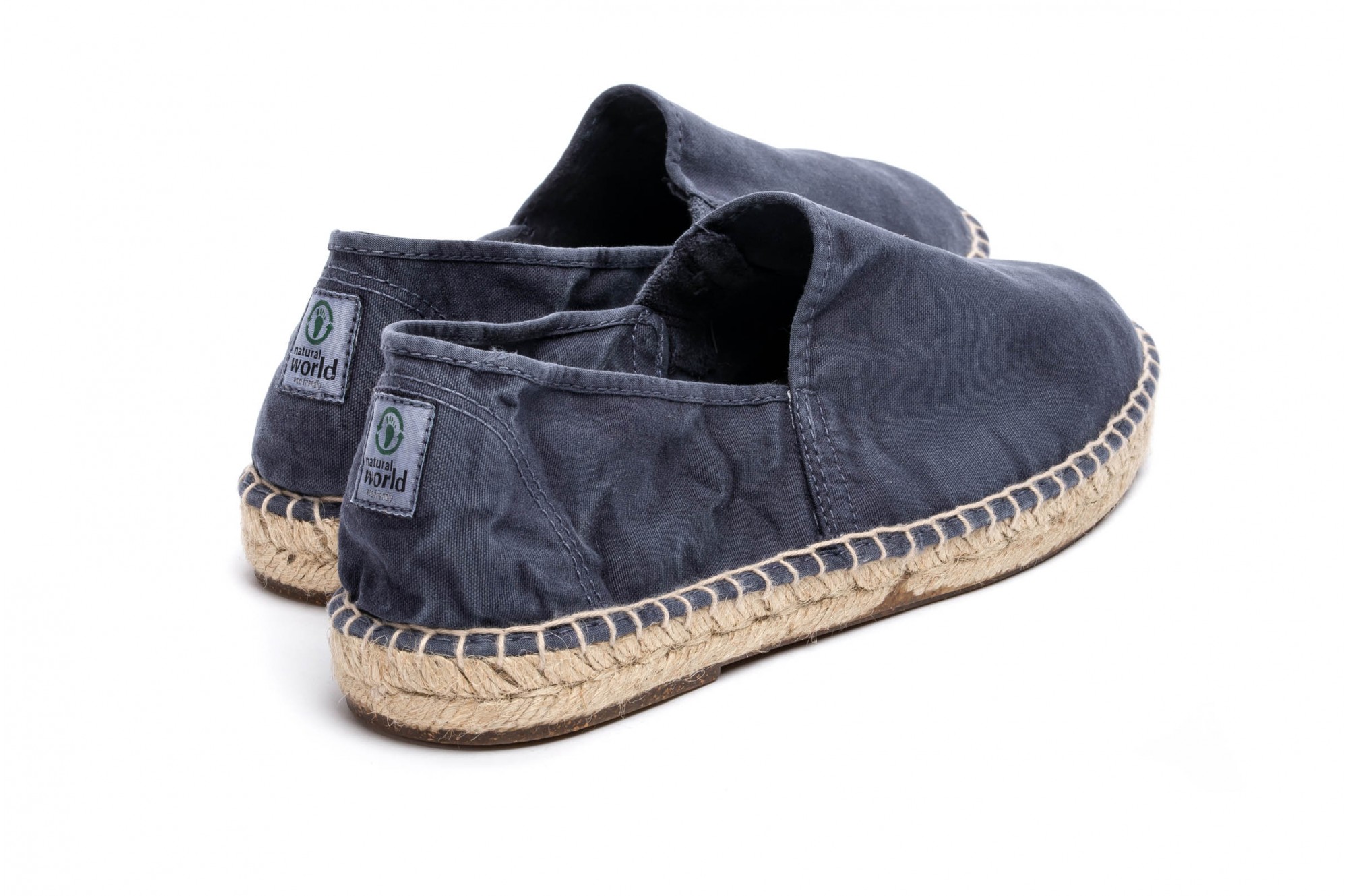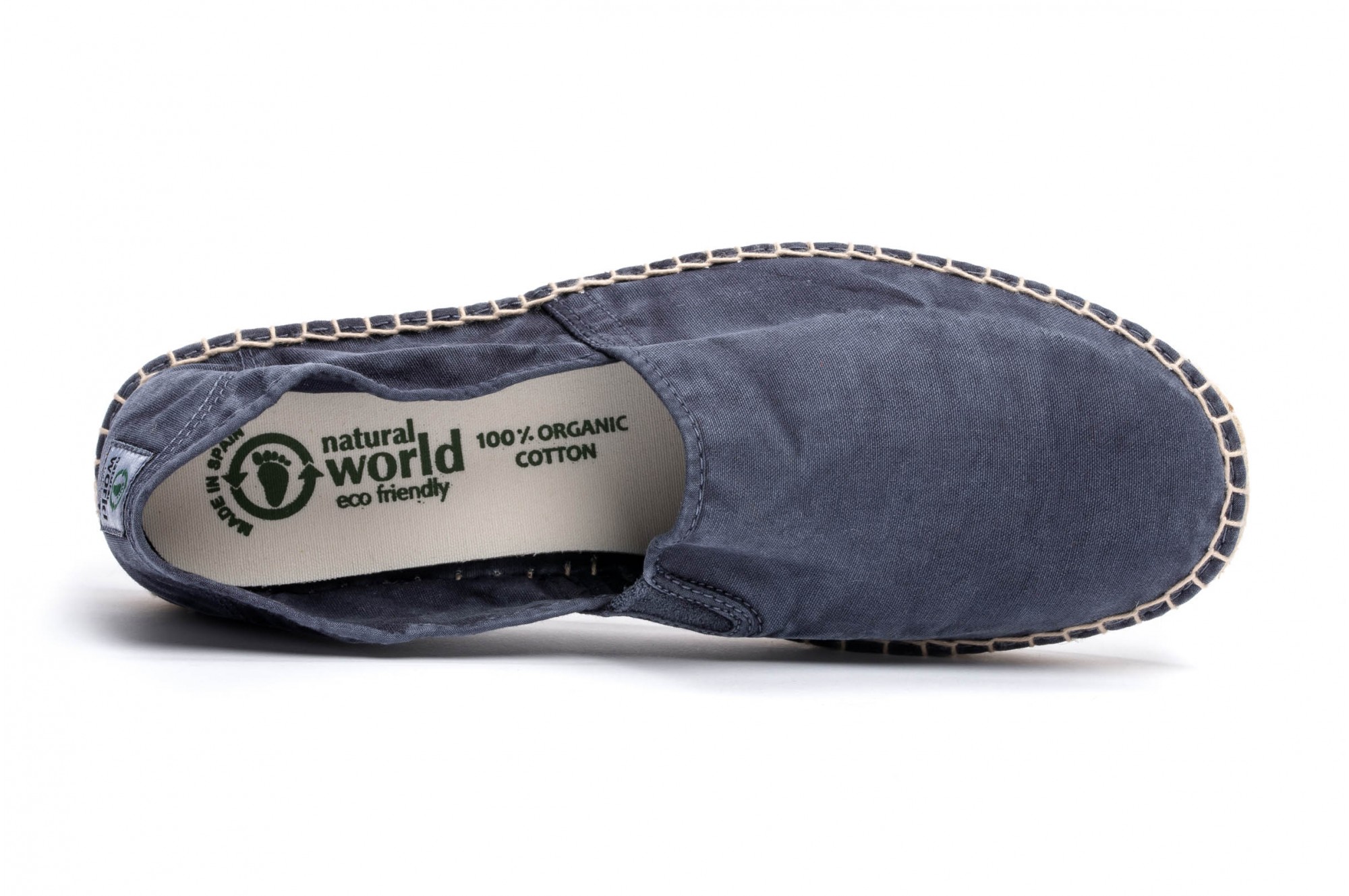 Natural World - 100% confectionate manual in Spania, materiale naturale 100% eco-friendly, inspirate din dragostea pentru natura. Espadrile din panza de bumbac organic, cu talpa confectionata din sfoara de iuta si cu un strat de cauciuc natural la exterior. La interior, talpa este acoperita cu aceeasi panza din bumbac folosita la exterior, si are suplimentar un brant detasabil, din spuma moale, cu fata de bumbac organic. Fata de panza are prevazut un mic elastic, in zona laterala interioara, care permite incaltarea usoara si face espadrila sa se muleze pe picior. Panza de bumbac si talpa din sfoara asigura respiratia piciorului si confort termic. Toate acestea fac espadrilele Natural World flexibile si confortabile, potrivite pentru sezonul cald, in zilele fara ploaie. Masuri: 39-46