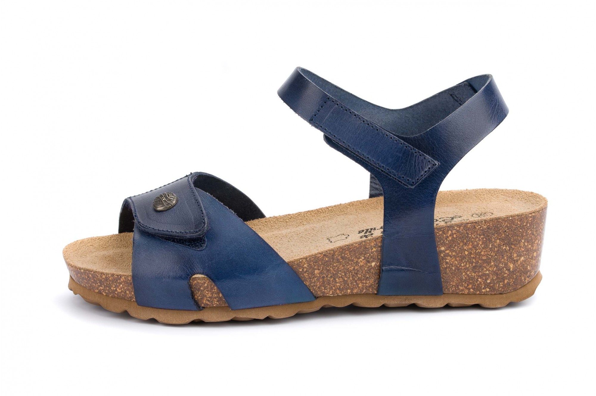 Sandale cu aspect contemporan, produse artizanal in sudul-vestul Frantei, aproape de Biarritz, intr-o firma cu o traditie pastrata de peste 50 de ani in aceeasi familie. Au fetele confectionate din piele naturala moale si placuta la atingere si cu talpa usoara, dintr-un material care are aspectul si elasticitatea plutei, avand la exterior un strat de protectie din cauciuc care ii sporeste durabilitatea. Brantul este din piele naturala poroasa, care asigura o respiratie naturala a talpii. Talpa are inaltimea de 4 cm la calcai si 2 cm in partea din fata. Fetele au largime reglabila cu velcro, iar inchiderea se face cu o bareta prevazuta cu velcro, in jurul gleznei. Masuri: 35-41